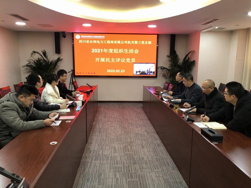 2022年2月23日,按照川水發展黨﹝2022﹞12號文件以及公司黨委要求,公司機關第三黨支部在成都總部和資陽辦公區以視頻方式召開2021年度組織生活會。公司黨委委員、總工程師汪輝德、副總經理董蜀良以普通黨員身份參加會議。市場開發部部長、機關第三黨支部書記丁毅主持會議。