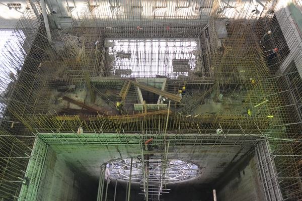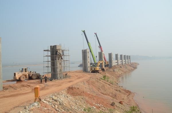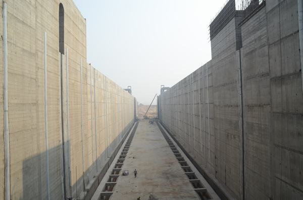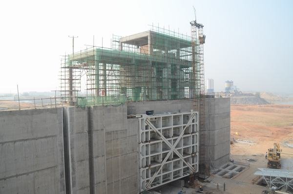 1#機組船閘閘室導航墩、靠船墩掛板施工公路橋蓋梁上閘首下游魚道