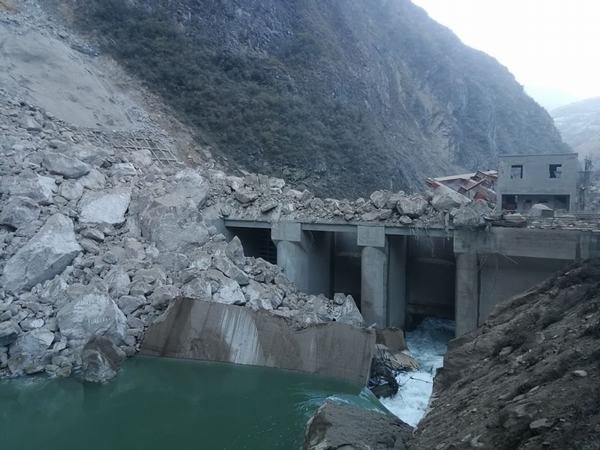 博瓦水電站首部樞紐工程于2019年11月初已通過下閘蓄水前的安全鑒定。2019年11月19日凌晨,在工程所在地發(fā)生3.9級地震,受地震影響,閘壩左右岸自然高邊坡發(fā)生高位巖體崩塌,大方量的左岸崩塌巖體自400米高處墜落,造成導流洞進口及取水口全部掩埋,上游河道嚴重淤堵,壩頂建筑物和金屬結構的全部損毀,施工現(xiàn)場的機械設備、材料等全部損毀掩埋,所幸無任何人員傷亡。閘壩1#、2#泄洪沖砂閘孔已被堵塞無法過流,只剩3#泄洪沖砂閘孔過流,庫區(qū)水位已雍高近6m,嚴重影響汛期河道安全行洪。
