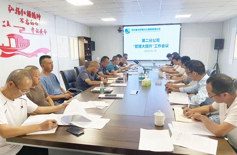 為積極貫徹落實“管理大提升”專項活動,按照公司“管理大提升”專項活動部署,2022年8月15日,二分公司在虎渡溪項目部召開“管理大提升”工作布置會,會議由二分公司黨支部書記、經理程靜主持,二分公司領導班子成員及各部門負責人參會。