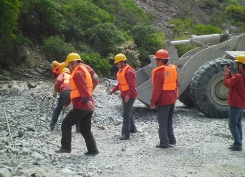 2014年5月14日14:00,固滴電站項目部常務副經理、防洪演練現場總指揮毛偉發出指令:“我部接到監理部轉木里縣氣象局通知,未來一小時內將有一次強降雨,水洛河水位將急劇暴漲,請各工作面所有施工人員迅速撤離現場并轉移現場機械設備及材料”。當聽到指令后,各施工班組在負責人的帶領下,所有人員快速、有序地撤離到指定的安全地點。與此同時,抗洪搶險小組成員在組長鄭中華、張方清的帶領下,迅速進入現場將設備和材料全部轉移至安全地點,最后清點人數。演練結束,整個過程有條不紊。