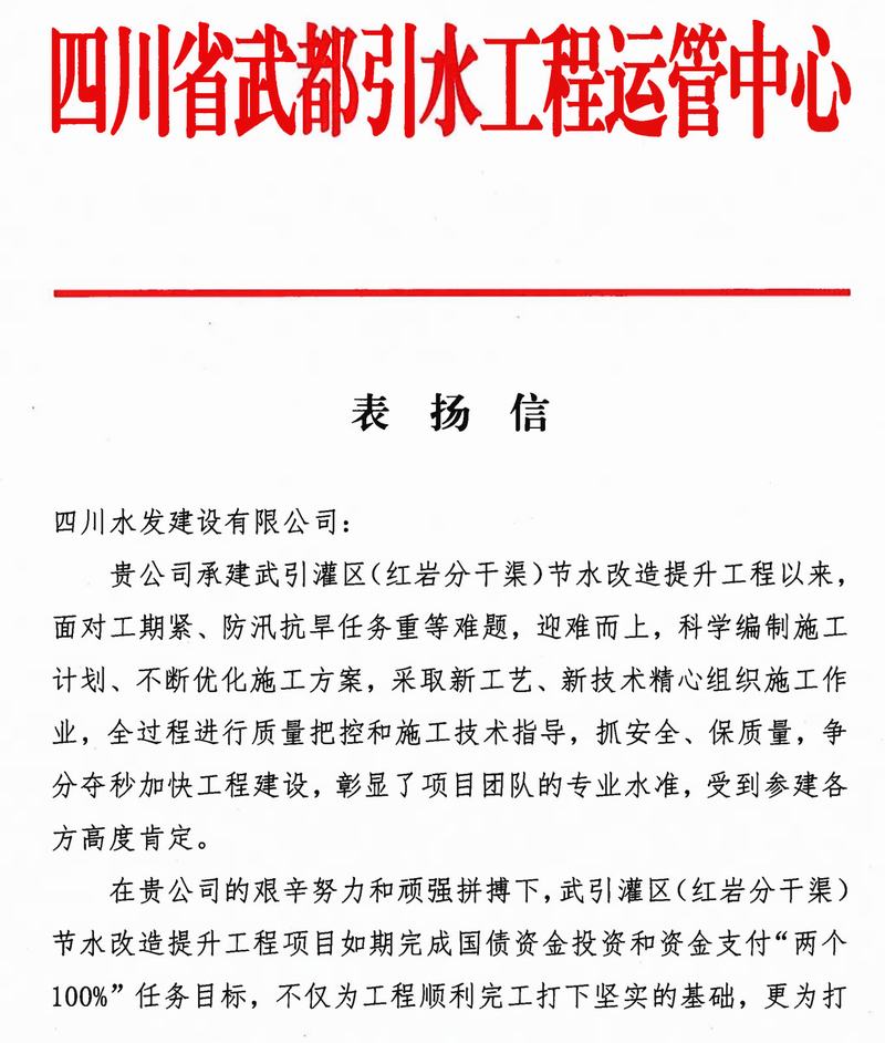 歲序更替 逐夢前行 公司收到四川省武都引水工程運營中心表揚信