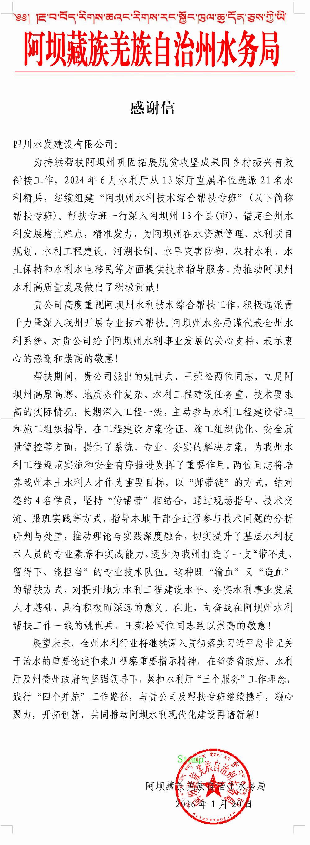 近日,公司收到阿壩藏族羌族自治州水務(wù)局的感謝信,信中對選派姚世兵、王榮松兩位技術(shù)骨干參與當(dāng)?shù)厮夹g(shù)綜合幫扶表示高度贊揚(yáng),并對公司重視幫扶工作、支持阿壩州水利事業(yè)發(fā)展致以衷心感謝與崇高敬意。