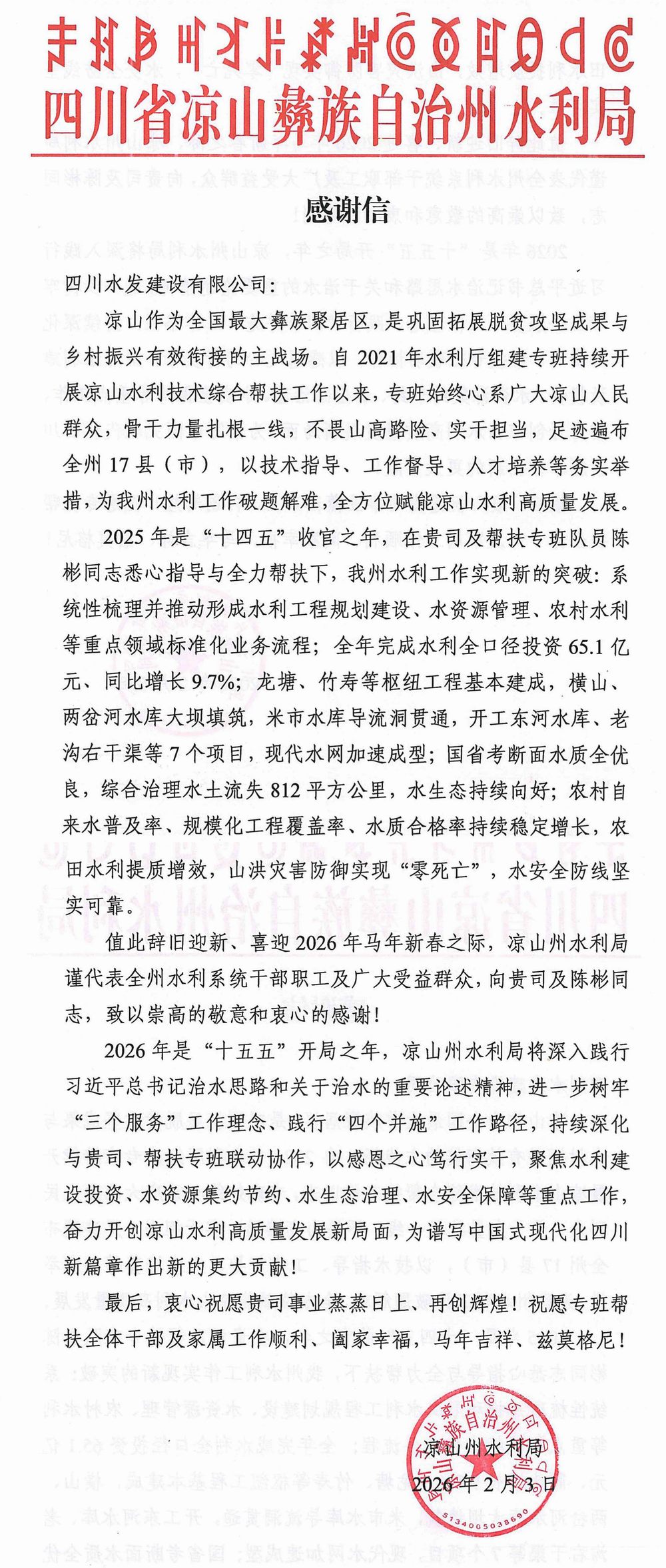 辭舊迎新啟華章,馬年納福送春來。在2026年新春佳節來臨之際,公司收到來自四川省涼山彝族自治州水利局的感謝信。信中,涼山州水利局向公司及幫扶專班陳彬同志致以崇高敬意與衷心感謝,并高度贊譽公司在涼山水利高質量發展中作出的突出貢獻。