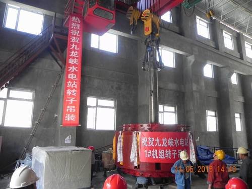 2015年5月31日15時28分,九龍峽水電站1號水輪發電機組轉子順利進入1#水輪發電機組機坑,成功吊裝就位。