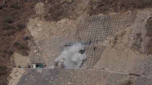 “清理現場物品”,“人員、車輛撤離”,“準備就緒”,“點火”,隨著一聲巨響,一股棉花般的濃煙出現在山腰。6月22日下午6時,新藏項目部8#施工支洞成功實施掛口爆破。