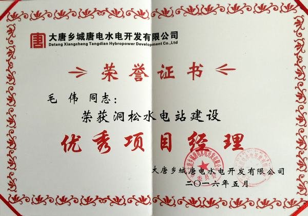 2016年5月10日16時(shí),大唐鄉(xiāng)城唐電水電開發(fā)有限公司在鄉(xiāng)城縣召開了簡(jiǎn)潔而隆重的“碩淉電站投產(chǎn)發(fā)電先進(jìn)表彰大會(huì)”,四川省水利電力工程局榮獲洞松水電站建設(shè)“重合同、守信用”單位榮譽(yù)稱號(hào),項(xiàng)目經(jīng)理毛偉榮獲洞松水電站建設(shè)“優(yōu)秀項(xiàng)目經(jīng)理”榮譽(yù)稱號(hào)。