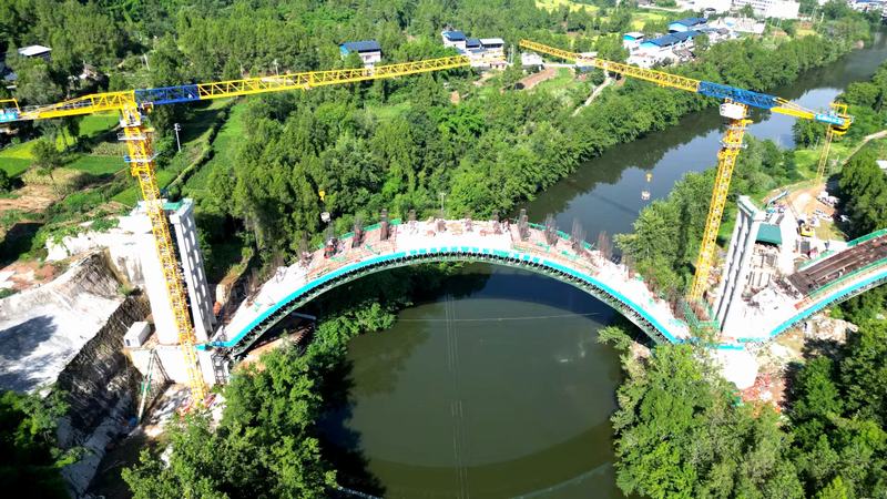 構(gòu)溪河渡槽位于閬中市石灘鎮(zhèn)境內(nèi)構(gòu)溪河上,渡槽全長(zhǎng)708m,最大架空高度達(dá)53m,是全線重點(diǎn)控制性工程。為保障施工順利推進(jìn),項(xiàng)目團(tuán)隊(duì)多措并舉克服高空作業(yè)風(fēng)險(xiǎn)大、技術(shù)要求高、大跨度拱圈澆筑難、持續(xù)高溫紅色預(yù)警等多項(xiàng)挑戰(zhàn),堅(jiān)守“內(nèi)斂堅(jiān)韌,勇毅篤行”企業(yè)精神,以“科學(xué)規(guī)范、集約高效”的精細(xì)化管理,統(tǒng)籌抓好質(zhì)量、安全、進(jìn)度、成本四大關(guān)鍵環(huán)節(jié)管控;創(chuàng)新采用“選擇代表性拱跨預(yù)壓”工藝,有效控制結(jié)構(gòu)變形;嚴(yán)格遵循“縱向分段、豎向分環(huán)”的澆筑方案,確保拱圈受力均勻和線形精準(zhǔn);加強(qiáng)數(shù)字化監(jiān)管賦能全流程預(yù)警與閉環(huán)監(jiān)管,最終安全、優(yōu)質(zhì)、高效完成合攏。